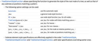 Automatic use the automatic style func a general node style function » Allfunc use node style function func for all nodes » TreeCases[pattern]func use func for nodes with data matching pattern » "Leaves"func use func for leaves » "NonLeaves"func use func for non-leaves » {pos1func1,pos2func2,…} use funci for the node at relative position posi » {patt1func1,patt2func2,…} use funci for nodes at positions matching patti » - Subtree element style specifications are effectively applied in the order TreeElementStyle, TreeElementStyleFunction and TreeElementShapeFunction, with later specifications overriding earlier ones.
