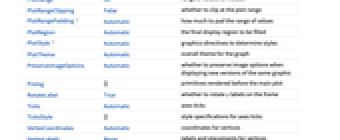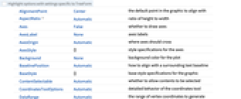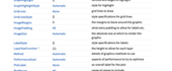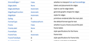 AlignmentPoint Center the default point in the graphic to align with AspectRatio Automatic ratio of height to width Axes False whether to draw axes AxesLabel None axes labels AxesOrigin Automatic where axes should cross AxesStyle {} style specifications for the axes Background None background color for the plot BaselinePosition Automatic how to align with a surrounding text baseline BaseStyle {} base style specifications for the graphic ContentSelectable Automatic whether to allow contents to be selected CoordinatesToolOptions Automatic detailed behavior of the coordinates tool DataRange Automatic the range of vertex coordinates to generate DirectedEdges False whether to interpret Rule as DirectedEdge EdgeLabels None labels and placements for edges EdgeLabelStyle Automatic style to use for edge labels EdgeShapeFunction Automatic generate graphic shapes for edges EdgeStyle Automatic styles for edges Epilog {} primitives rendered after the main plot FormatType TraditionalForm the default format type for text Frame False whether to put a frame around the plot FrameLabel None frame labels FrameStyle {} style specifications for the frame FrameTicks Automatic frame ticks FrameTicksStyle {} style specifications for frame ticks GraphHighlight {} vertices and edges to highlight GraphHighlightStyle Automatic style for highlight GridLines None grid lines to draw GridLinesStyle {} style specifications for grid lines ImageMargins 0. the margins to leave around the graphic ImagePadding All what extra padding to allow for labels etc. ImageSize Automatic the absolute size at which to render the graphic LabelStyle {} style specifications for labels LayerSizeFunction (1) the height to allow for each layer Method Automatic details of graphics methods to use PerformanceGoal Automatic aspects of performance to try to optimize PlotLabel None an overall label for the plot PlotRange All range of values to include PlotRangeClipping False whether to clip at the plot range PlotRangePadding Automatic how much to pad the range of values PlotRegion Automatic the final display region to be filled PlotStyle Automatic graphics directives to determine styles PlotTheme Automatic overall theme for the graph PreserveImageOptions Automatic whether to preserve image options when displaying new versions of the same graphic Prolog {} primitives rendered before the main plot RotateLabel True whether to rotate y labels on the frame Ticks Automatic axes ticks TicksStyle {} style specifications for axes ticks VertexCoordinates Automatic coordinates for vertices VertexLabels None labels and placements for vertices VertexLabelStyle Automatic style to use for vertex labels VertexShape Automatic graphic shape for vertices VertexShapeFunction Automatic generate graphic shapes for vertices VertexSize Automatic size of vertices VertexStyle Automatic styles for vertices