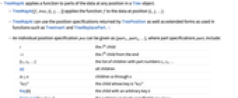 child from the end{i1,i2,…} the list of children with part numbers i1, i2, … All all children m;;n children m through n "key" the child whose key is "key" Key[k] the child with an arbitrary key k TreeLevel[levelspec] the subtrees on levels specified by levelspec TreeCases[pattern] the subtrees with data matching pattern TreeSelect[crit] the subtrees for which crit gives True - In TreeMapAt[f,tree,{p1,p2,…}], {p1,p2,…} is interpreted as a list of individual position specifications if all the pi are lists. Otherwise, {p1,p2,…} will be taken to be an individual position specification. »