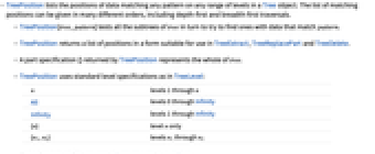 - TreePosition lists the positions of data matching any pattern on any range of levels in a Tree object. The list of matching positions can be given in many different orders, including depth-first and breadth-first traversals.