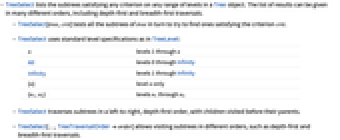 - TreeSelect[…,TreeTraversalOrderorder] allows visiting subtrees in different orders, such as depth-first and breadth-first traversals.