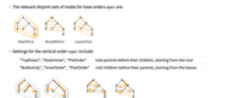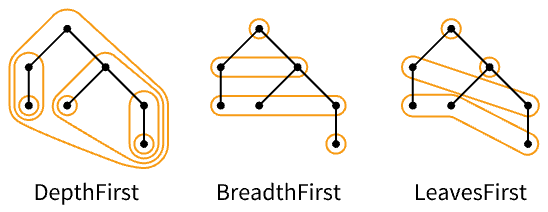 "DepthFirst" traverse the entire subtree before traversing its next sibling "BreadthFirst","LevelOrder" visit nodes by level starting from the root "LeavesFirst" visit nodes by level starting from the leaves - The relevant disjoint sets of nodes for base orders tspec are: