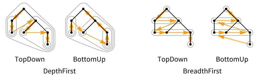 "TopDown","OuterInner","PreOrder" visit parents before their children, starting from the root "BottomUp","InnerOuter","PostOrder" visit children before their parents, starting from the leaves - Additional settings for the vertical order vspec for "DepthFirst" tspec include: