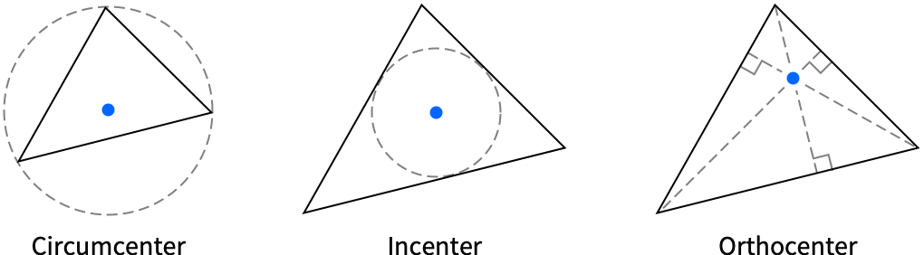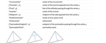 {"AngleBisectingCevianEndpoint",p} endpoint of the cevian bisecting the angle at the vertex p "Centroid" centroid {"CevianEndpoint",center,p} endpoint of the cevian passing through the vertex p and the specified center "Circumcenter" center of the circumcircle {"Excenter",p} center of the excircle opposite from the vertex p {"Foot",p} foot of the altitude passing through the vertex p "Incenter" center of the incircle {"Midpoint",p} midpoint of the side opposite from the vertex p "NinePointCenter" center of nine-point circle "Orthocenter" orthocenter {"SymmedianEndpoint",p} endpoint of the symmedian passing through the vertex p "SymmedianPoint" symmedian point - The following line types can be given: