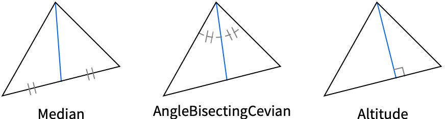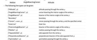 {"Altitude",p} altitude passing through the vertex p {"AngleBisectingCevian",p} cevian bisecting the interior angle at the vertex p {"AngleBisector",p} bisector of the interior angle at the vertex p "Boundary" boundary {"Cevian",center,p} cevian passing through the vertex p and the specified center "EulerLine" Euler line {"ExteriorAngleBisector",p} bisector of the exterior angle at the vertex p {"Median",p} median passing through the vertex p {"OppositeSide",p} side opposite from the vertex p {"PerpendicularBisector",p} perpendicular bisector of the side opposite from p {"Symmedian",p} symmedian passing through the vertex p - The following circle types can be given: