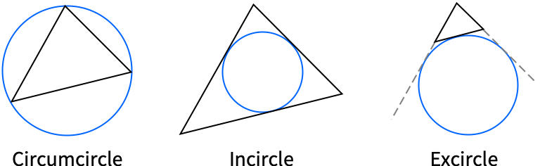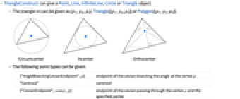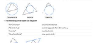 "Circumcircle" circumscribed circle {"Excircle",p} excircle opposite from the vertex p "Incircle" inscribed circle "NinePointCircle" nine-point circle - The following triangle types can be given: