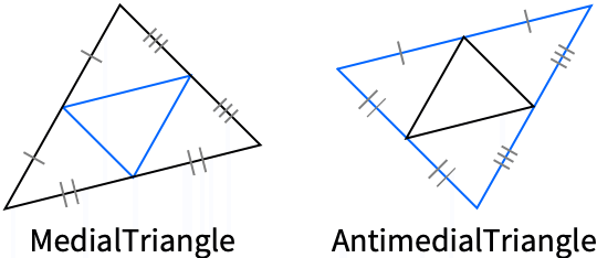 "AntimedialTriangle" antimedial triangle "MedialTriangle" medial triangle "Triangle" original triangle - In the form {"type",p}, p can be a symbolic point specification in a GeometricScene, or it can be an explicit vertex of the form {x,y}, Point[{x,y}] or the index i of the vertex. When given in the short form "type", the vertex p2 is used.