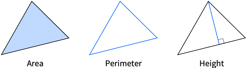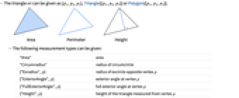 "Area" area "Circumradius" radius of circumcircle {"Exradius",p} radius of excircle opposite vertex p {"ExteriorAngle",p} exterior angle at vertex p {"FullExteriorAngle",p} full exterior angle at vertex p {"Height",p} height of the triangle measured from vertex p "Inradius" radius of incircle {"InteriorAngle",p} interior angle at vertex p "NinePointRadius" radius of nine-point circle "Perimeter" perimeter "Semiperimeter" semiperimeter - In the form {"type",p}, p can be a symbolic point specification in a GeometricScene, or it can be an explicit vertex of the form {x,y}, Point[{x,y}] or the index i of the vertex. When given in the short form "type", the vertex p2 is used.