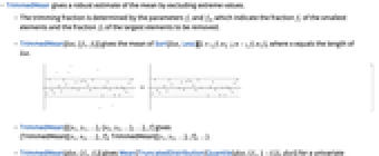 - TrimmedMean[list,{f1,f2}] gives the mean of Sort[list,Less]〚1+