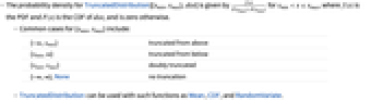 {-∞,xmax} truncated from above {xmin,∞} truncated from below {xmin,xmax} doubly truncated {-∞,∞},None no truncation - TruncatedDistribution can be used with such functions as Mean, CDF, and RandomVariate.