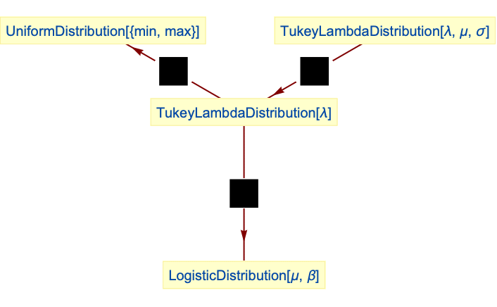 - TukeyLambdaDistribution is related to a number of other distributions. TukeyLambdaDistribution generalizes a number of distributions including LogisticDistribution and UniformDistribution, in the sense that the PDFs of TukeyLambdaDistribution[0], TukeyLambdaDistribution[1], and TukeyLambdaDistribution[2] are precisely the same as those of LogisticDistribution[0,1], UniformDistribution[{-1,1}], and UniformDistribution[{-1/2,1/2}], respectively. For certain values of λ, TukeyLambdaDistribution[λ] shares qualitative properties with CauchyDistribution and NormalDistribution and hence is also closely related to LogNormalDistribution, BetaDistribution, and PearsonDistribution.