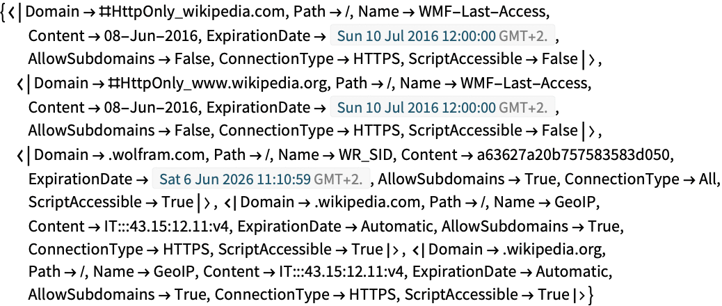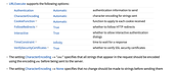 Authentication Automatic authentication information to send CharacterEncoding Automatic character encoding for strings sent CookieFunction Automatic function to apply to each cookie received FollowRedirects True whether to follow HTTP redirects Interactive True whether to allow interactive authentication dialogs TimeConstraint Infinity time to wait for a response VerifySecurityCertificates True whether to verify SSL security certificates - The setting CharacterEncoding->"enc" specifies that all strings that appear in the request should be encoded using the encoding enc before being sent to the server.