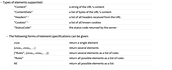 elem return a single element {elem1,elem2,…} return several elements {"Rules",{elem1,elem2,…}} return several elements as a list of rules "Rules" return all possible elements as a list of rules All return all possible elements as a list - The following options can be given:
