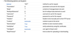 Method "GET" method to use for request "Parameters" {} parameters to be sent for the request "Body" "" contents of message body to be sent "MultipartElements" {} list of multipart data elements to send "Username" "" username to use for the request "Password" "" password to use for the request "Headers" {} headers to be manually sent to the HTTP server "Cookies" Automatic cookies to pass to the server "StoreCookies" True whether to store received cookies "VerifyPeer" True verify authenticity using SSL certificates "UserAgent" Automatic user agent string to send "ReadTimeout" 0 time to allow for uploading or downloading data "ConnectTimeout" 0 time to allow for connecting to the server "FollowRedirects" True whether to follow redirects - Allowed times are by default given in seconds.
