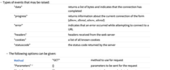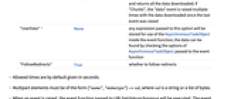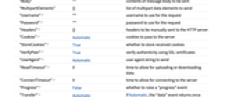 Method "GET" method to use for request "Parameters" {} parameters to be sent for the request "Body" "" contents of message body to be sent "MultipartElements" {} list of multipart data elements to send "Username" "" username to use for the request "Password" "" password to use for the request "Headers" {} headers to be manually sent to the HTTP server "Cookies" Automatic cookies to pass to the server "StoreCookies" True whether to store received cookies "VerifyPeer" True verify authenticity using SSL certificates "UserAgent" Automatic user agent string to send "ReadTimeout" 0 time to allow for uploading or downloading data "ConnectTimeout" 0 time to allow for connecting to the server "Progress" False whether to raise a "progress" event "Transfer" Automatic if Automatic, the "data" event returns once and returns all the data downloaded; if "Chunks", the "data" event is raised multiple times with the data downloaded since the last event was raised "UserData" None any expression passed to this option will be stored for use of the AsynchronousTaskObject inside the event function; the data can be found by checking the options of AsynchronousTaskObject passed to the event function "FollowRedirects" True whether to follow redirects - Allowed times are by default given in seconds.