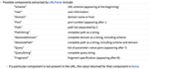 "Scheme" URL scheme (appearing at the beginning) "User" user information "Domain" domain name or host "Port" port number (appearing after :) "Path" path list (separated by /) "PathString" complete path as a string "AbsoluteDomain" complete domain as a string, including scheme "AbsolutePath" complete path as a string, including scheme and domain "Query" list of parameter-value pairs (appearing after ?) "QueryString" complete query string "Fragment" fragment specification (appearing after #) - If a particular component is not present in the URL, the value returned for that component is None.