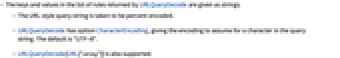 - URLQueryDecode has option CharacterEncoding, giving the encoding to assume for a character in the query string. The default is "UTF-8".