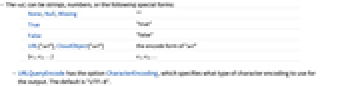 None,Null,Missing "" True "true" False "false" URL["url"],CloudObject["url"] the encode form of "url" {e1,e2,…} e1, e2, … - URLQueryEncode has the option CharacterEncoding, which specifies what type of character encoding to use for the output. The default is "UTF-8".