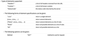 "Headers" a list of all headers received from the URL "Cookies" a list of all known cookies "StatusCode" the status code returned by the server - The following forms of element specifications can be given: