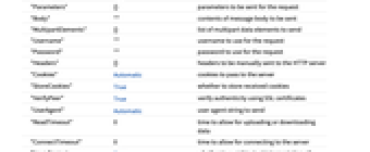 Method "GET" method to use for request "Parameters" {} parameters to be sent for the request "Body" "" contents of message body to be sent "MultipartElements" {} list of multipart data elements to send "Username" "" username to use for the request "Password" "" password to use for the request "Headers" {} headers to be manually sent to the HTTP server "Cookies" Automatic cookies to pass to the server "StoreCookies" True whether to store received cookies "VerifyPeer" True verify authenticity using SSL certificates "UserAgent" Automatic user agent string to send "ReadTimeout" 0 time to allow for uploading or downloading data "ConnectTimeout" 0 time to allow for connecting to the server BinaryFormat True whether to avoid textual interpretation of newlines or other data "FollowRedirects" True whether to follow redirects