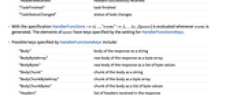 "BodyReceived" response body successfully received "BodyChunkReceived" chunk of body received "ConnectionFailed" URL connection failed "CookiesReceived" cookies successfully received "HeadersReceived" headers successfully received "TaskFinished" task finished "TaskStatusChanged" status of task changes - With the specification HandlerFunctions-><|…,"eventi"->fi,…|>, fi[assoc] is evaluated whenever eventi is generated. The elements of assoc have keys specified by the setting for HandlerFunctionsKeys.