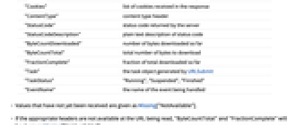 "Body" body of the response as a string "BodyByteArray" raw body of the response as a byte array "BodyBytes" raw body of the response as a list of byte values "BodyChunk" chunk of the body as a string "BodyChunkByteArray" chunk of the body as a byte array "BodyChunkBytes" chunk of the body as a list of byte values "Headers" list of headers received in the response "Cookies" list of cookies received in the response "ContentType" content type header "StatusCode" status code returned by the server "StatusCodeDescription" plain text description of status code "ByteCountDownloaded" number of bytes downloaded so far "ByteCountTotal" total number of bytes to download "FractionComplete" fraction of total downloaded so far "Task" the task object generated by URLSubmit "TaskStatus" "Running", "Suspended", "Finished" "EventName" the name of the event being handled - Values that have not yet been received are given as Missing["NotAvailable"].