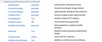 Authentication Automatic authentication information to send CharacterEncoding Automatic character encoding for strings received ConnectionSettings Automatic speed and other settings for the connection CookieFunction Automatic function to apply to each cookie received FollowRedirects True whether to follow HTTP redirects HandlerFunctions <||> how to handle events generated HandlerFunctionsKeys Automatic what parameters to supply to handler functions Interactive True whether to allow interactive authentication dialogs TimeConstraint Infinity time to wait for a response VerifySecurityCertificates True whether to verify SSL security certificates