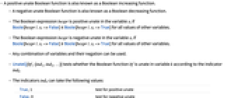 - The Boolean expression bexpr is positive unate in the variable xi if Boole[bexpr/.xi->False]≤Boole[bexpr/.xi->True] for all values of other variables.