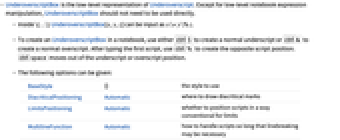 BaseStyle {} the style to use DiacriticalPositioning Automatic where to draw diacritical marks LimitsPositioning Automatic whether to position scripts in a way conventional for limits MultilineFunction Automatic how to handle scripts so long that linebreaking may be necessary - In StandardForm, UnderoverscriptBox[x,y,z] is interpreted on input as Underoverscript[x,y,z].