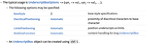 BaseStyle {} base style specifications DiacriticalPositioning Automatic proximity of diacritical characters to base character LimitsPositioning Automatic position underscripts as limits MultilineFunction Automatic content handling for long UnderscriptBox - An UnderscriptBox object can be created using