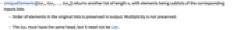 - Order of elements in the original lists is preserved in output. Multiplicity is not preserved.