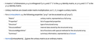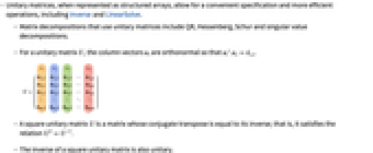 - Unitary matrices, when represented as structured arrays, allow for a convenient specification and more efficient operations, including Inverse and LinearSolve.