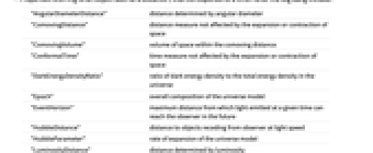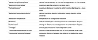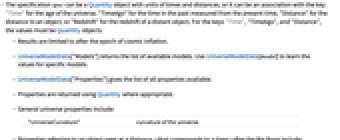 "AngularDiameterDistance" distance determined by angular diameter "ComovingDistance" distance measure not affected by the expansion or contraction of space "ComovingVolume" volume of space within the comoving distance "ConformalTime" time measure not affected by the expansion or contraction of space "DarkEnergyDensityRatio" ratio of dark energy density to the total energy density in the universe "Epoch" overall composition of the universe model "EventHorizon" maximum distance from which light emitted at a given time can reach the observer in the future "HubbleDistance" distance to objects receding from observer at light speed "HubbleParameter" rate of expansion of the universe model "LuminosityDistance" distance determined by luminosity "MatterEnergyDensityRatio" ratio of matter density to the total energy density in the universe "MaximumUniverseAge" maximum age the universe can ever reach "ParticleHorizon" maximum distance traveled by light from the Big Bang to a given time "RadiationEnergyDensityRatio" ratio of radiation density to the total energy density in the universe "RadiationTemperature" temperature of background radiation "Redshift" shift in wavelength due to expansion or contraction of space "ScaleFactor" change in distance due to expansion or contraction of space "TimeAgo" time in past measured from the present time "TotalObservableRadiusFraction" fraction of the universe seen out of total possible for all time "TransverseComovingDistance" comoving distance between two objects located at the same redshift - model can be specified by one of the available models, by supplying the parameters for the composition of the universe, or by supplying the model and the parameters that diverge from it.