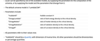 "HubbleH0" Hubble constant H "OmegaLambda" ratio of dark energy density to the critical density "OmegaMatter" ratio of matter density to the critical density "OmegaRadiation" ratio of radiation density to the critical density "OmegaK" ratio of curvature density to the critical density - All parameters refer to their values now.