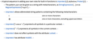 - The pattern patt can be given as a string with metacharacters, as StringExpression[…] or as RegularExpression["regex"]. »