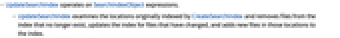 - UpdateSearchIndex examines the locations originally indexed by CreateSearchIndex and removes files from the index that no longer exist, updates the index for files that have changed, and adds new files in those locations to the index.