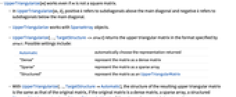 Automatic automatically choose the representation returned "Dense" represent the matrix as a dense matrix "Sparse" represent the matrix as a sparse array "Structured" represent the matrix as an UpperTriangularMatrix - With UpperTriangularize[…,TargetStructureAutomatic], the structure of the resulting upper triangular matrix is the same as that of the original matrix, if the original matrix is a dense matrix, a sparse array, a structured DiagonalMatrix or a structured UpperTriangularMatrix. Otherwise, a dense matrix is returned.