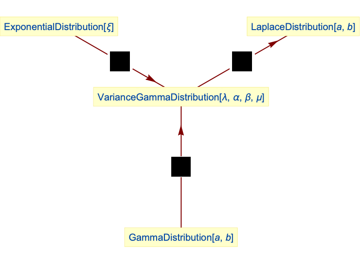 . VarianceGammaDistribution can be realized as transformations (TransformedDistribution) of ExponentialDistribution, GammaDistribution, and NormalDistribution and is closely related to HyperbolicDistribution, LogNormalDistribution, BetaDistribution, and PearsonDistribution.