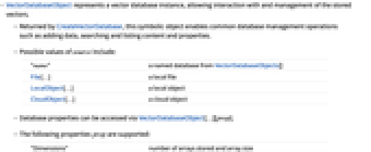 "name" a named database from VectorDatabaseObjects[] File[…] a local file LocalObject[…] a local object CloudObject[…] a cloud object - Database properties can be accessed via VectorDatabaseObject[…][prop].