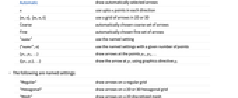 None draw no arrows Automatic draw automatically selected arrows n use upto n points in each direction {m,n}, {m,n,k} use a grid of arrows in 2D or 3D Coarse automatically chosen coarse set of arrows Fine automatically chosen fine set of arrows "name" use the named setting {"name",n} use the named settings with a given number of points {p1,p2,…} draw arrows at the points p1, p2, … {{p1,g1},…} draw the arrow at p1 using graphics directive g1 - The following are named settings: