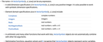 Complexes complex numbers Integers integers Reals real numbers NonNegativeReals real numbers x with x≥0 PositiveReals real numbers x with x>0 - In arithmetic and many other functions that work with lists, VectorSymbol objects do not automatically combine with other list arguments.
