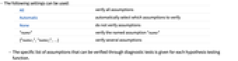 All verify all assumptions Automatic automatically select which assumptions to verify None do not verify assumptions "name" verify the named assumption "name" {"name1","name2",…} verify several assumptions - The specific list of assumptions that can be verified through diagnostic tests is given for each hypothesis testing function.