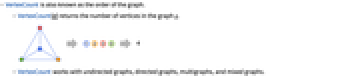 - VertexCount works with undirected graphs, directed graphs, multigraphs, and mixed graphs.