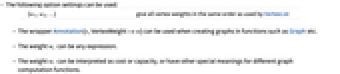 {w1,w2,…} give all vertex weights in the same order as used by VertexList - The wrapper Annotation[v,VertexWeight->w] can be used when creating graphs in functions such as Graph etc.