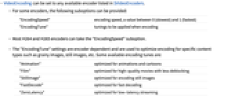"EncodingSpeed" encoding speed, a value between 0 (slowest) and 1 (fastest) "EncodingTune" tunings to be applied when encoding - Most H264 and H265 encoders can take the "EncodingSpeed" suboption.