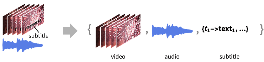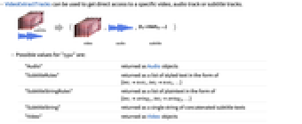 "Audio" returned as Audio objects "SubtitleRules" returned as a list of styled text in the form of {int1text1,int2text2,…} "SubtitleStringRules" returned as a list of plaintext in the form of {int1string1,int2string2,…} "SubtitleString" returned as a single string of concatenated subtitle texts "Video" returned as Video objects - In VideoExtractTracks[video,trackspec], trackspec can take any specification allowed by Extract.