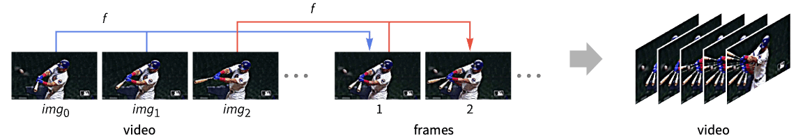 gives a video whose frames are {f[img0,img1], f[f[img0,img1],img2],…}, where imgi are frames of video.