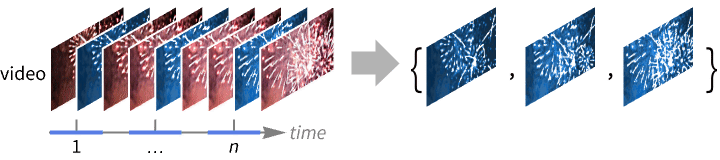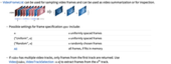 n n uniformly spaced frames {"Uniform",n} n uniformly spaced frames {"Random",n} n randomly chosen frames All all frames, if fits in memory - If video has multiple video tracks, only frames from the first track are returned. Use Video[video,VideoTrackSelectionn] to extract frames from the n