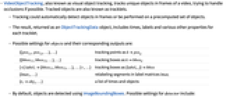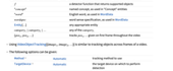 f a detector function that returns supported objects "concept" named concept, as used in "Concept" entities "word" English word, as used in WordData wordspec word sense specification, as used in WordData Entity[…] any appropriate entity category1|category2|… any of the categoryi {pos1,pos2,…} tracks pos1, … given on first frame throughout the video - Using VideoObjectTracking[{image1,image2,…}] is similar to tracking objects across frames of a video.