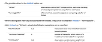 "IOUThreshold" 0.2 intersection over union threshold between bounding boxes "OcclusionThreshold" 8 number of frames for which history of a tracklet is maintained before expiration "OCMWeight" 0.2 observation-centric motion weight that accounts for the directionality of moving bounding boxes "TimeStepORU" 3 length of tracklet history to step back for tracklet re-update - With Method->{"RunningBuffer",subopt}, the following suboptions can be specified: